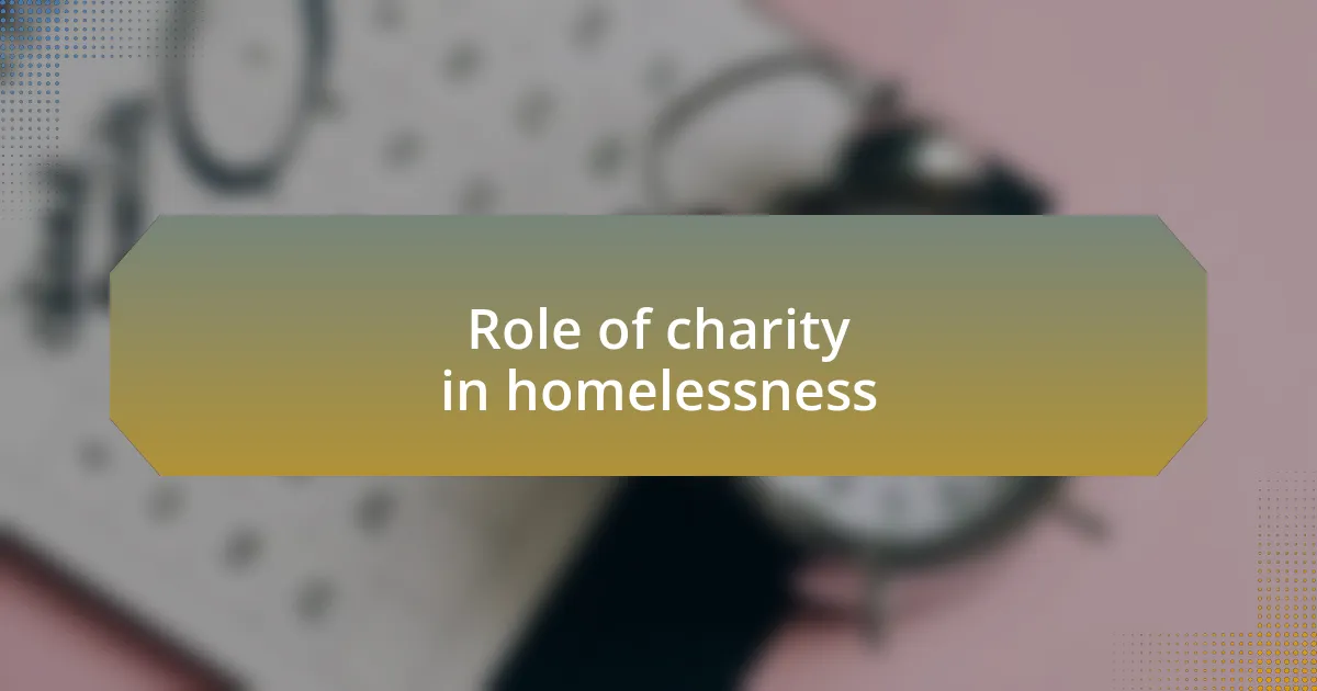 Charity plays a crucial role in addressing homelessness, acting as a lifeline for those in need. I remember the moment I walked into a local shelter for the first time, feeling both hope and apprehension. Within those walls, I found a community that offered not just a place to sleep, but connections with others who understood my struggles—reminding me I wasn’t alone.